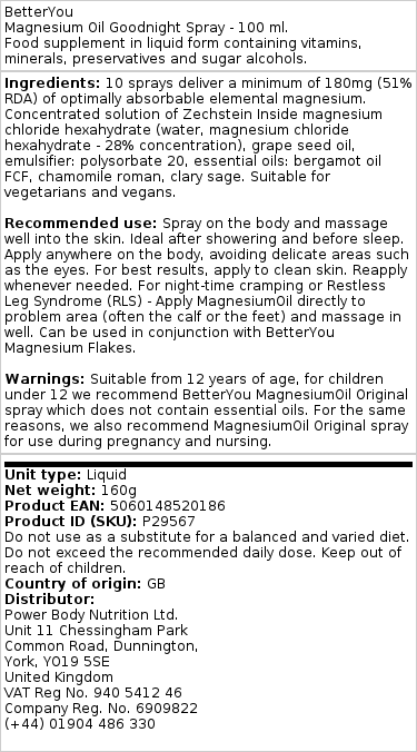 Otkrijte moć magnezija u praktičnom spreju! BetterYou Magnesium Sleep Body Spray je dizajniran kako bi podržao opuštanje i pripremu tijela za odmor. S 100 ml ovog inovativnog proizvoda, uživajte u prednostima magnezija na jednostavan i efikasan način.