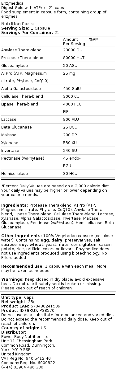 - Tvrdnje: Enzimi prisutni u formuli tradicionalno se koriste za podršku zdrave probave.Sadrži komponente koje doprinose normalnom metabolizmu energije.