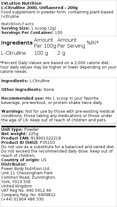 Upoznajte EVLution nutrition – L-Citrulline 2000, Unflavoured – 200g