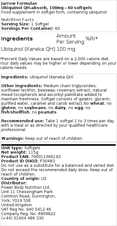 Jarrow er et fantastisk firma, og dette produkt er fantastisk til absorption af ubiquinol. 120 sofgels er fantastisk og holder et stykke tid, 100 mg en anstændig dosis. Store fordele som du ved for ubiquinol, gratis racicals at arbejde på, mange anvendelser. pakken er i fede farver. Kvaliteten er fabelagtig. Som ved, at du kan stole på Jarrow-produkter.