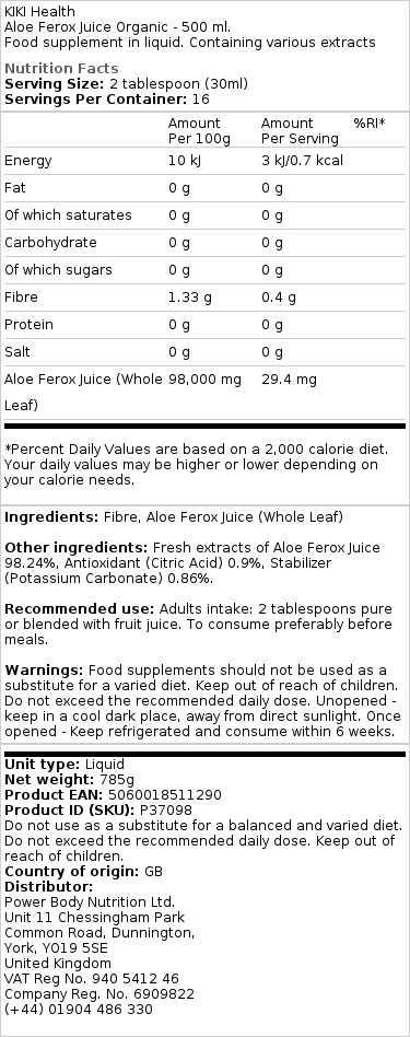 Ingredients: Aloe Ferox Juice (Whole Leaf), Fresh extracts of Aloe Ferox Juice 98.24%, Antioxidant (Citric Acid) 0.9%, Stabilizer (Potassium Carbonate) 0.86%.