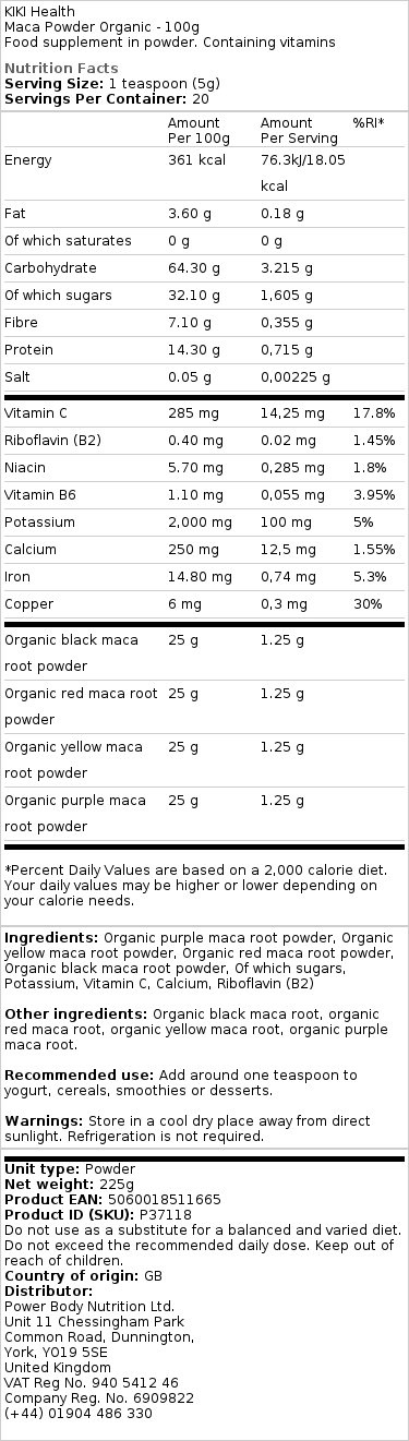Otkrijte snagu peruanske ande s KIKI Health Maca Powder, 100% prirodnim dodatkom prehrani u prahu koji dolazi iz srca Perua.Ovaj proizvod je idealan za one koji traže prirodnu podršku svom tijelu i dobrobiti.