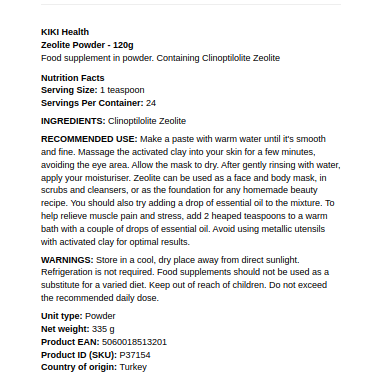 Otkrijte prirodnu snagu KIKI Health – zeolite Powder, 100% prirodnog mineralnog praha iz Turske, dizajniranog da podrži vaš zdrav životni stil. Ovaj fino mljeveni zeolitni prah lako se miješa s vodom ili sokom,čineći ga savršenim dodatkom vašoj dnevnoj rutini.