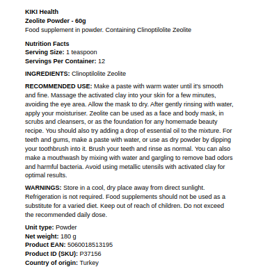 Otkrijte prirodnu snagu zeolita u obliku finog praha,idealnog za svakodnevnu upotrebu. KIKI Health Zeolite Powder dolazi iz čistih izvora u Turskoj i predstavlja visokokvalitetan dodatak prehrani.