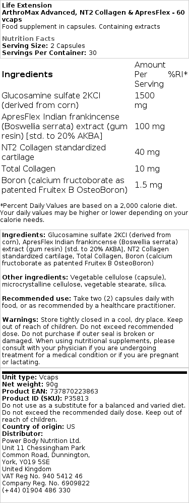 Life Extension – ArthroMax Advanced, NT2 Collagen & ApresFlex je pažljivo formuliran dodatak prehrani koji sadrži kombinaciju visokokvalitetnih sastojaka namijenjenih podršci zdravlju. S 60 kapsula u pakiranju, ovaj proizvod je dizajniran da se lako uklopi u vaš svakodnevni režim.