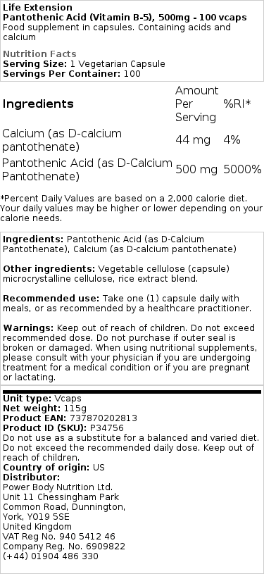 Jeg elsker at bruge life extension bits, så jeg er meget glad for at finde ud af, at de gør dette tilskud, hvilket er det, jeg har ledt efter, da jeg ikke får nok vitamin b5 i min kost, da det kommer fra æggeblomme og frø og nødder alligevel spiser jeg ikke rigtig meget fedt i min kost, jeg holder mig også til æggehvider!! Dette er også et vandopløseligt vitamin, så det er godt, at den menneskelige krop nemt vil bruge dette vigtige vitamin!
