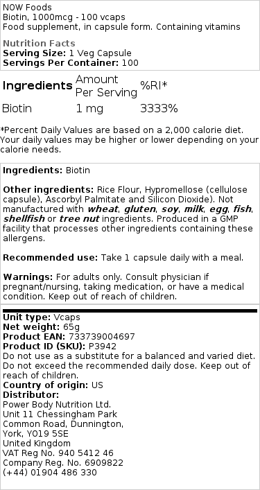 Fantastisk kosttilskud til dine negle, understøtter aminosyremetabolisme og fremmer normal immunfunktion. Portionsstørrelsen er 1 vegetabilsk kapsel, tag en kapsel dagligt med et måltid og spiller en afgørende rolle for hudens sundhed, især hår og negle. Biotin er et nøgleelement i fedtsyresyntesen. NU er mærker fantastiske!!