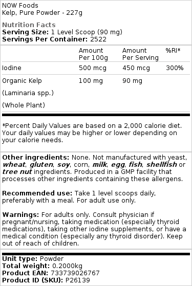 - Tvrdnje: Jod iz kelpa doprinosi normalnoj produkciji hormona štitnjače i normalnoj funkciji štitnjače te pomaže u održavanju zdrave kože.