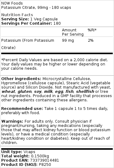 Jeg kan godt lide NOW-produkter til at begynde med. Dette kalium er, hvad jeg har brug for, og jeg tror, det er et godt produkt til at hjælpe mig med mine helbredsproblemer. Jeg synes, det er en kvalitetsingrediens. Jeg anbefaler dette produkt til dem, der har et behov. Min ordre blev leveret rettidigt, og det sætter jeg pris på. Det var pakket godt ind og har en god størrelse til mine behov.