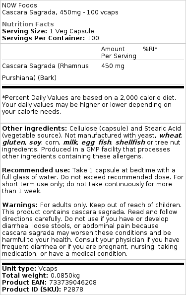 Disse er vidunderlige! Hverken senna-te eller magnesium taget på tom mave kunne hjælpe med at lindre min forstoppelse (disse to virker normalt for de fleste mennesker). Cascara sagrada virker som magi! Det er meget blidere end enten magnesium eller senna, som nogle gange kan forårsage diarré. Jeg vil gerne sende min oprigtige tak til NOW for at sælge disse ting.
