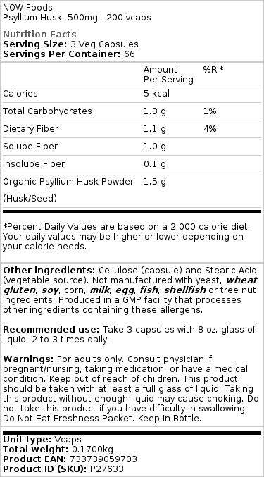 Upoznajte NOW Psyllium Husk 500 mg (200 Veg Capsules)