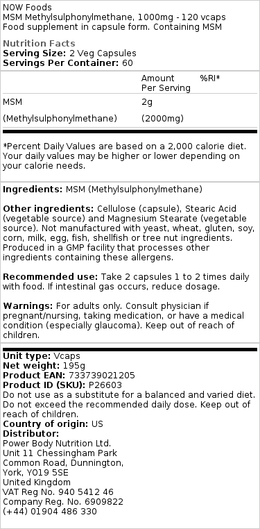 Fantastisk kvalitet til en overkommelig pris på Ecosupplements, der drager fordel af den nuværende kampagne. NOW Foods er et mærke, jeg stoler på, og dette produkt har ingen grimme ingredienser eller fyldstoffer, så det er godt nok til mig. Jeg tager to tabletter, to gange om dagen med mad. Siden jeg begyndte at supplere med MSM, har jeg mindre smerter i mine led, især i mit venstre knæ. Jeg vil fortsætte med at supplere med MSM,