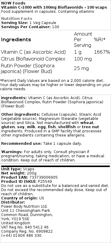 Hej kvalitets C-vitamin med tilsat bioflavonoider fuldender mit wellness-program for led og lår. Det hjælper med optagelsen af kollagen og glucosamin. Det høje niveau af aktive ingredienser hjælper også med at holde immunitet og nervesystem i balance. Kapslens størrelse er god, nem at sluge og smager ikke.