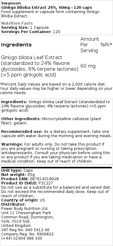 Dette er et af de bedste kosttilskud, jeg nogensinde har prøvet / taget. Jeg startede med dette for dets påståede hukommelsesforbedrende effekter, men det gør så meget mere. Mere energi, mere blodgennemstrømning overalt (!!). Jeg tror endda, det har hjulpet mit syn. Det har helt sikkert givet mig mere pust i den mandlige libido afdeling. Så meget mere, jeg tror, at Swanson bør overveje at tilføje dette til sin Passion-serie af produkter. Jeg vil dog understrege, at du bør starte langsomt op med dette. Jeg startede med at tage en 60 mg kapsel om dagen om morgenen, og det fik mig til at føle mig decideret forbundet i flere dage. Jeg byggede gradvist min dosering op til fire kapsler om dagen (to med morgenmad, to med aftensmad), og dette synes at være den optimale dosis for mig. Denne 60 mg kapsel er ideel, da den vil give dig mere fleksibilitet end med de højere doseringshætter. Hvis du leder efter en meningsfuld sammenligning, giver denne ginkgo mig mere effekt end enten maca eller tribulus for mandlig libido – begge dele tager jeg også. Jeg tror personligt, at ginkgos virkninger skyldes lige så meget dens evne til at forhindre nedbrydning af neurotransmitter i hjernen, som dens blodgennemstrømningsfremmende egenskaber. Værd at undersøge selv.