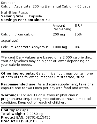 Otkrijte kako možete podržati svoje zdravlje uz pomoć kalcija u obliku aspartata, jednog od najučinkovitijih oblika za optimalnu apsorpciju. Swanson Calcium Aspartate pruža 200 mg elementarnog kalcija po kapsuli,što ga čini izvrsnim dodatkom vašoj svakodnevnoj prehrani.
