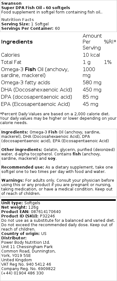Ingredients: Omega-3 Fish Oil (anchovy, sardine, mackerel) (DHA (Docosahexaenoic Acid), DPA (Docosapentaenoic Acid), EPA (Eicosapentaenoic Acid)), Gelatin, glycerin, purified (deionized) water, d-alpha tocopherol. Contains fish (anchovy, sardine, mackerel) and soy.